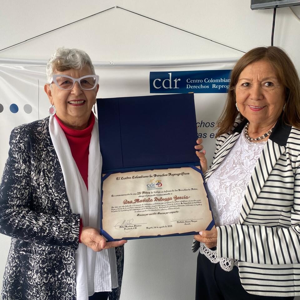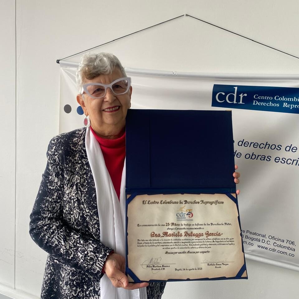 El Centro Colombiano de Derechos Reprográficos (CDR) entregó personalmente un reconocimiento a la escritora Ana Mariela Zuluaga García, en honor a su destacada trayectoria y a toda una vida dedicada a la creación de contenidos académicos y literarios.