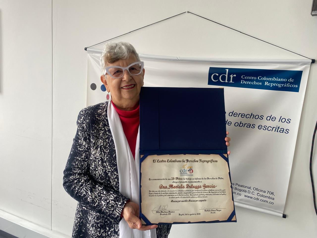 El Centro Colombiano de Derechos Reprográficos (CDR) entregó personalmente un reconocimiento a la escritora Ana Mariela Zuluaga García, en honor a su destacada trayectoria y a toda una vida dedicada a la creación de contenidos académicos y literarios.